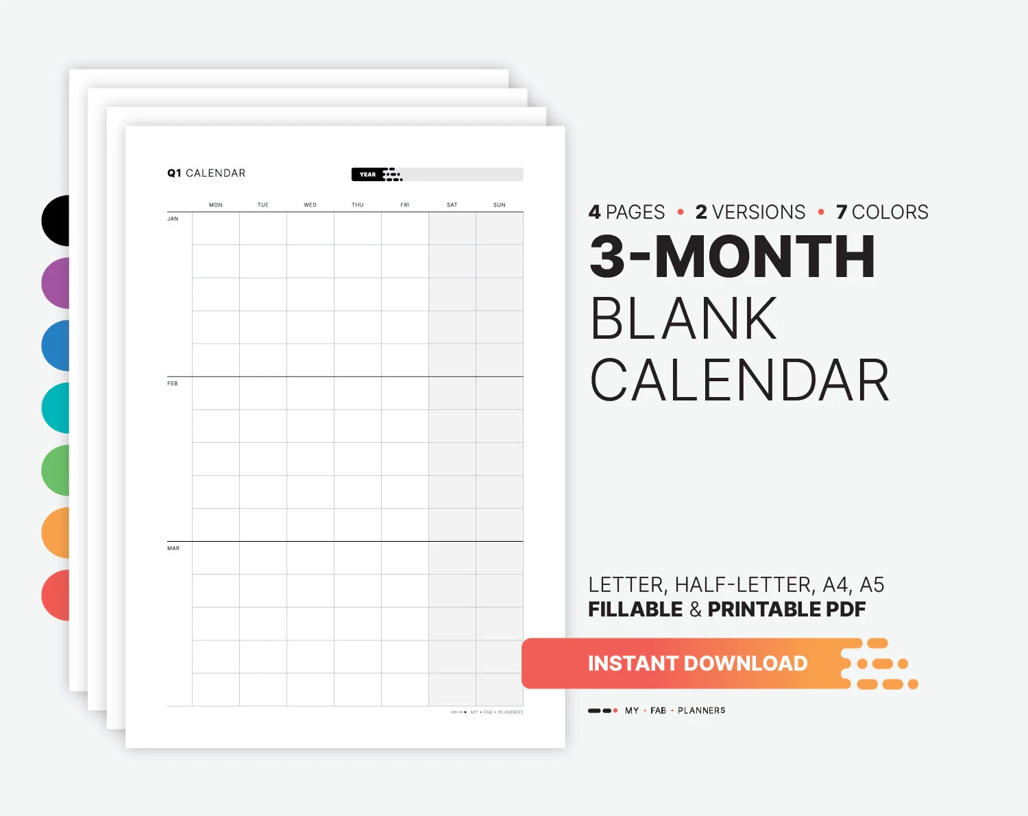 3 Month Calendar 3 Month Printable Calendar 90 Day Plan Instant Download Wall Calendar Large Wall Calendar Etsy