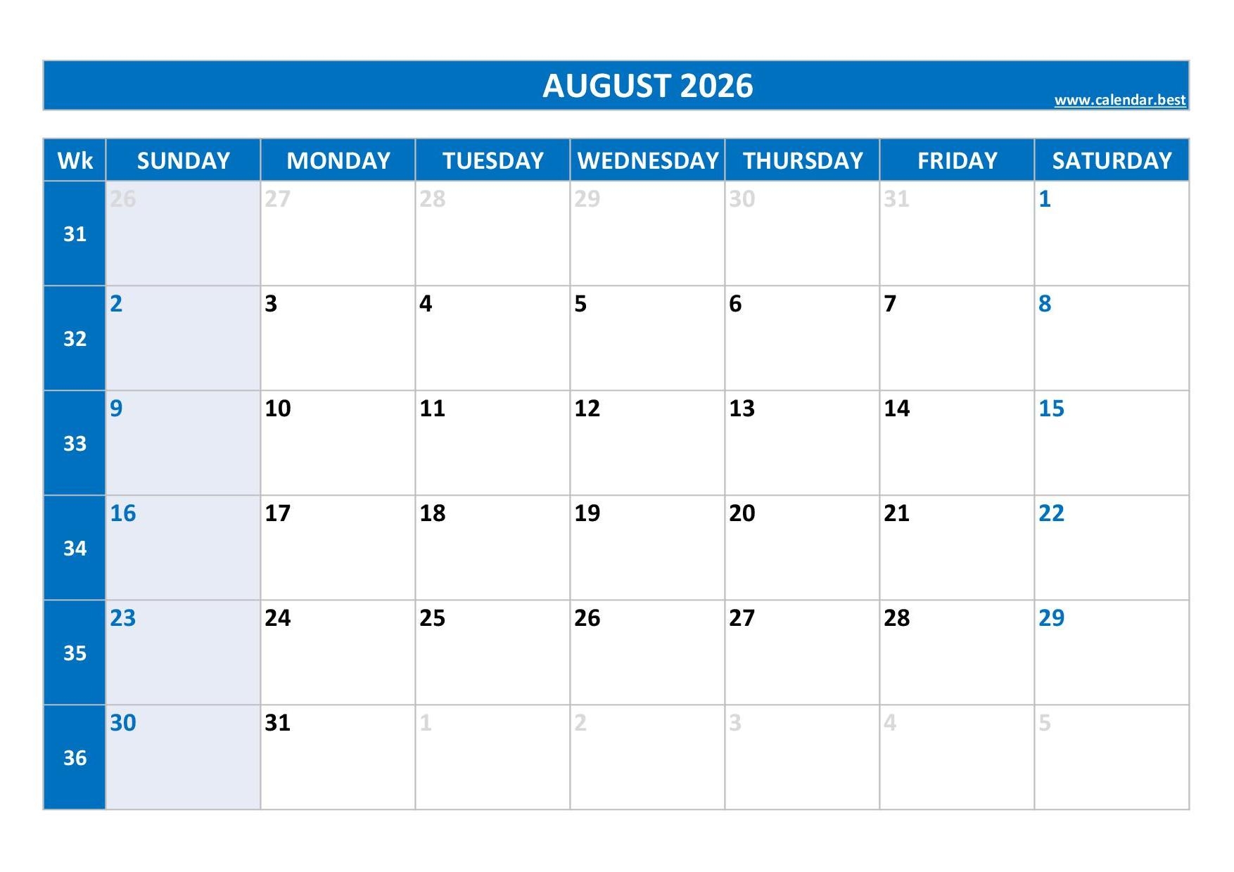 Printable August 2026 Calendar