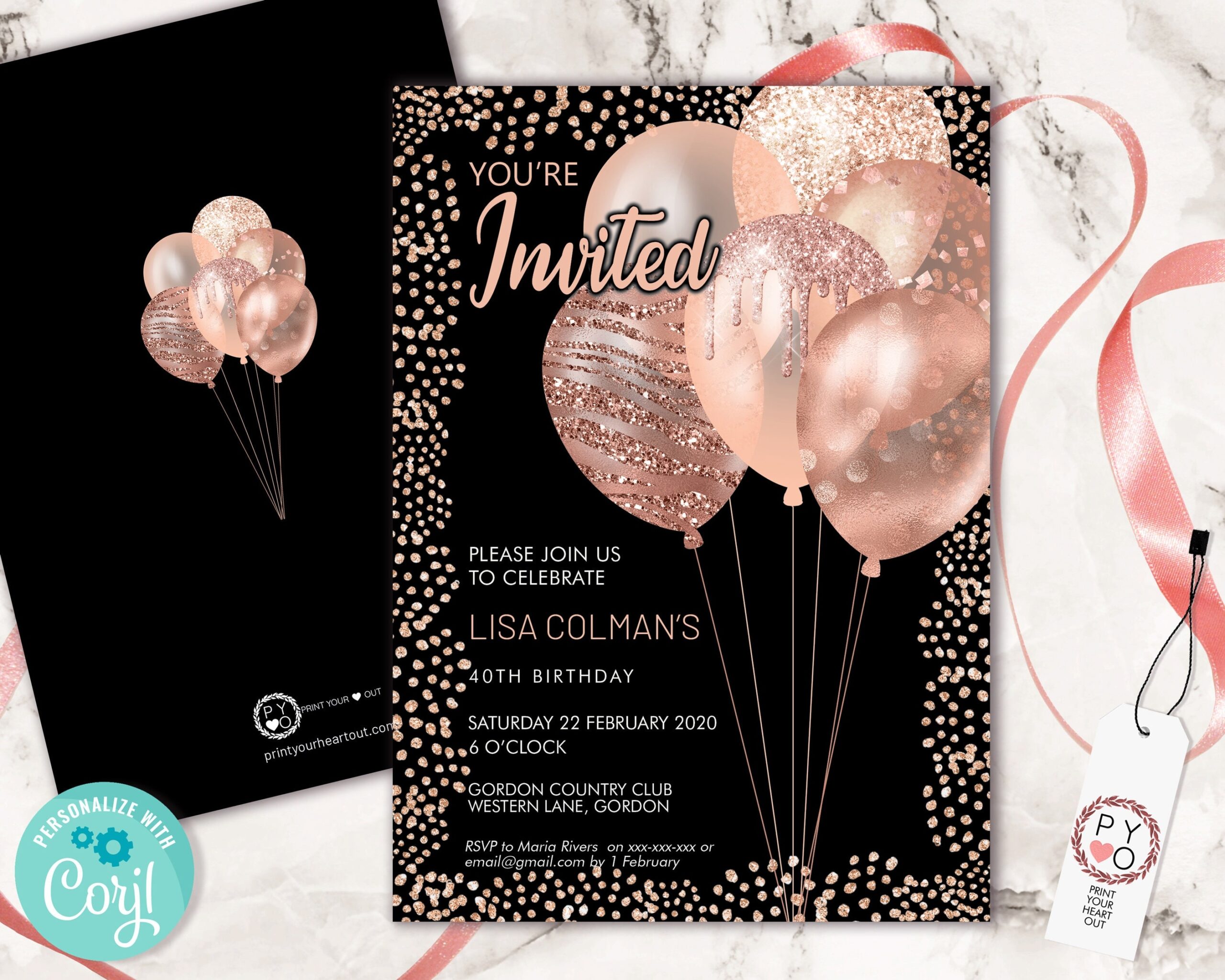 Rose Gold Birthday Balloons Invitation Printable Template Black Gold Glitter Editable Birthday Party Invitation For Women Printable Card