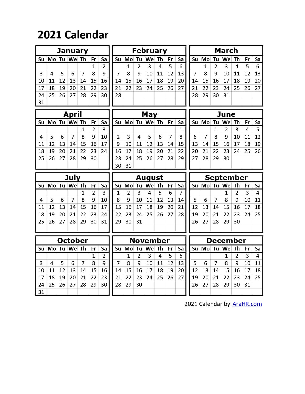 2021 Calendar Yearly Monthly Free Printable Template Excel PDF Image ARAHR