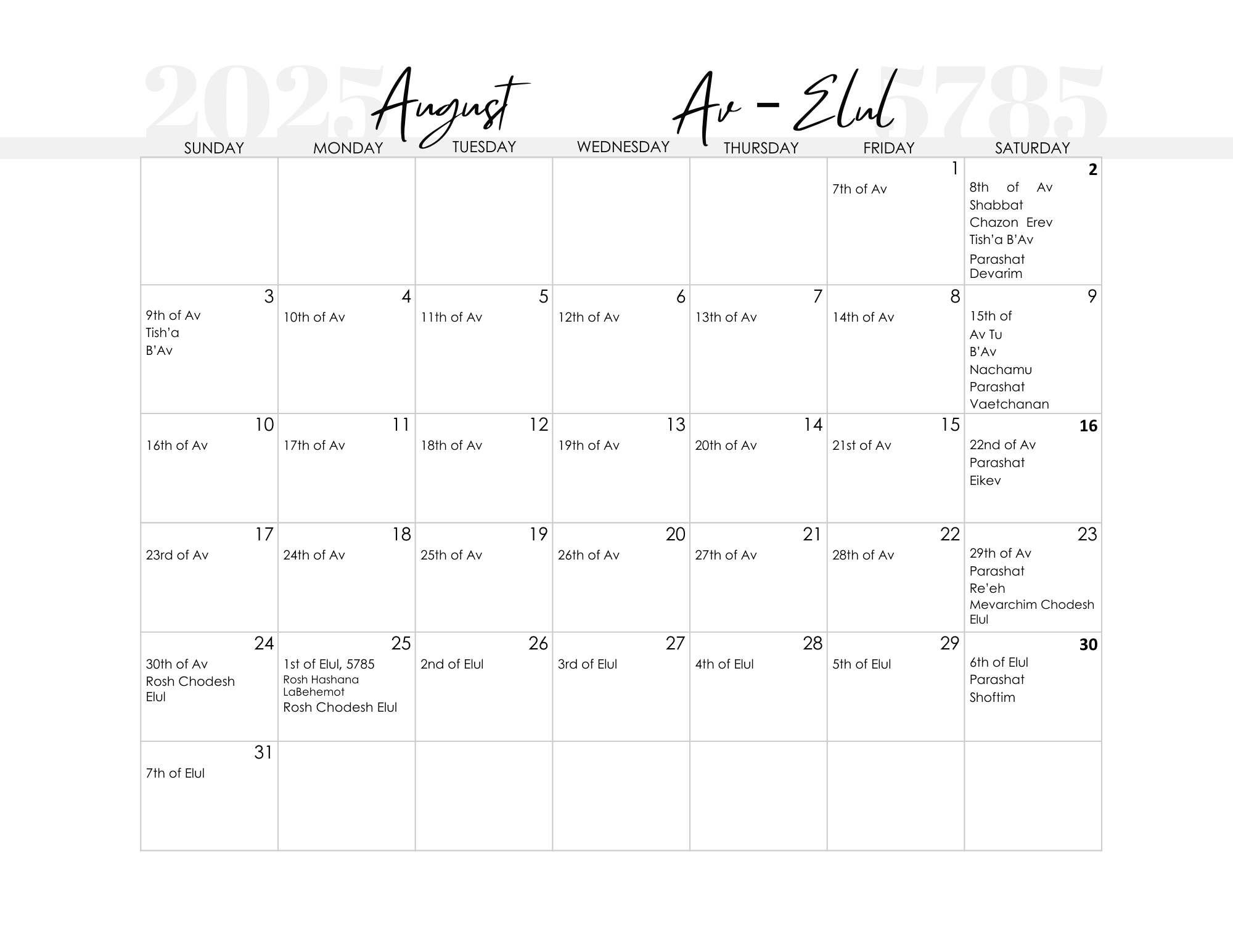FREE Printable Jewish Calendar 2025 2026 2027 2028 2029 2030