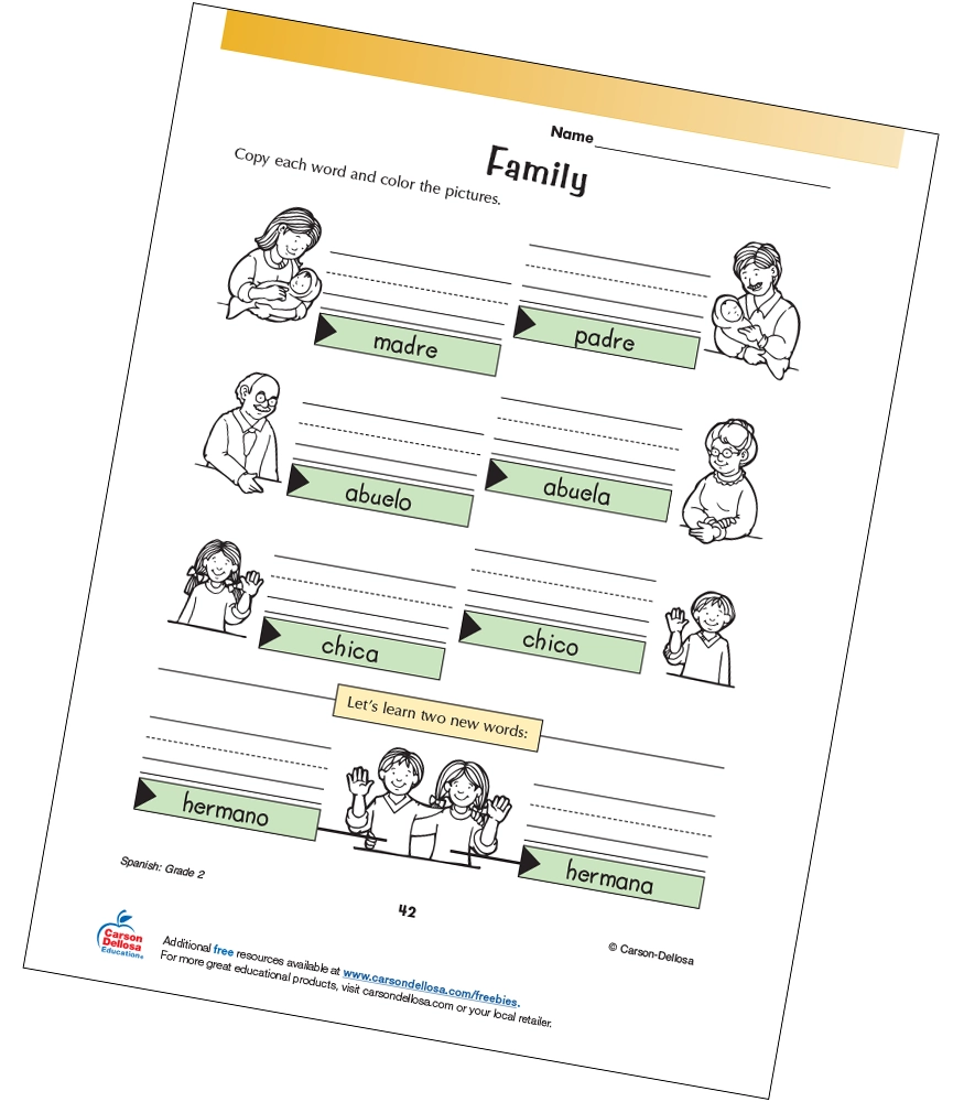 On this worksheet, kids will find a variety of family members such as madre (mother), padre (father), abuela (grandmother), abuelo (grandfather), hermano (brother), and hermana (sister). They can color the pictures, match the words to the correct family member, and even practice writing the words themselves.