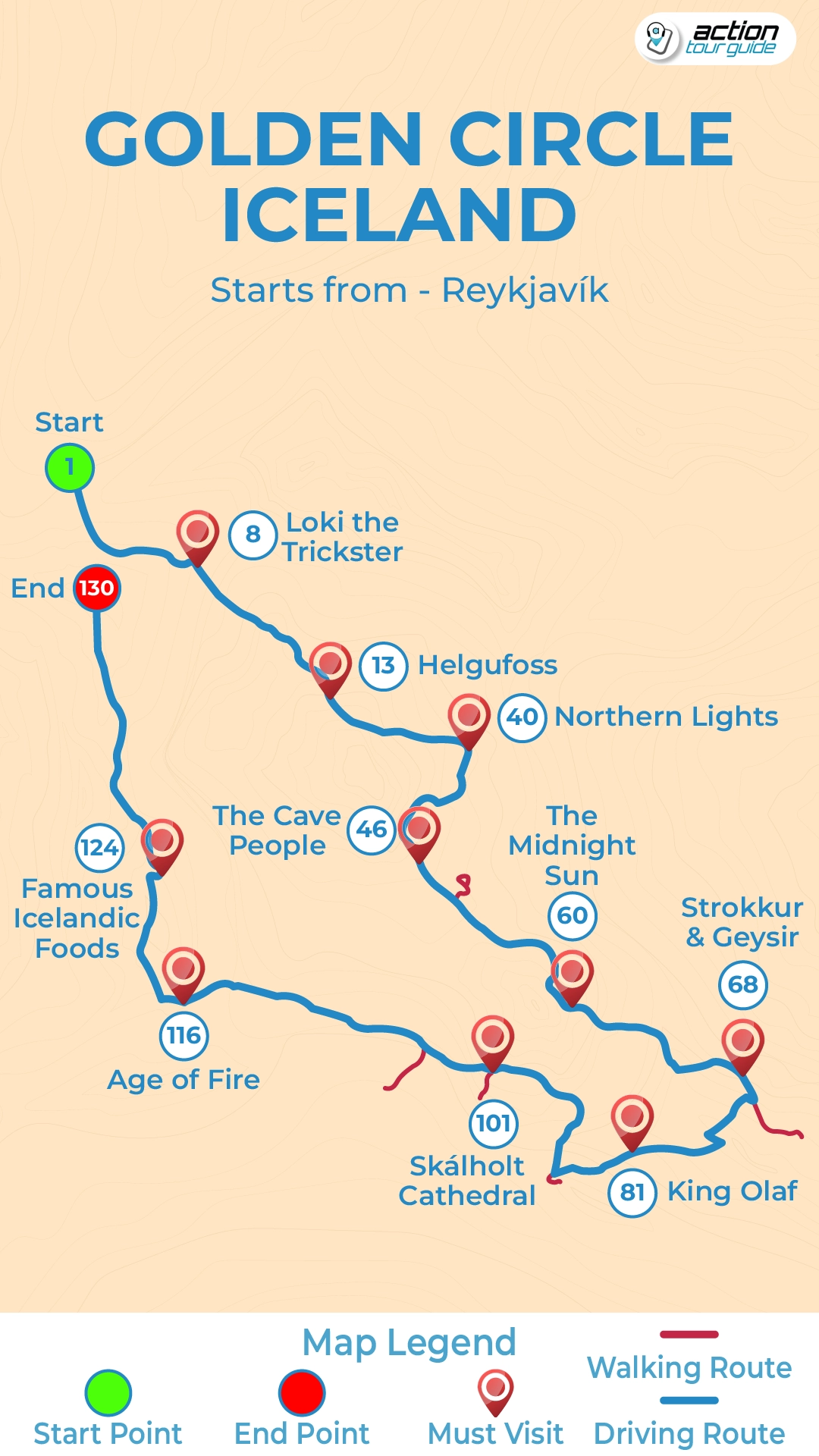 The Golden Circle is a 300-kilometer loop that covers some of Iceland’s most stunning natural attractions, including Thingvellir National Park, Geysir geothermal area, and Gullfoss waterfall. Having a map on hand can ensure you don’t miss any of these must-see spots.