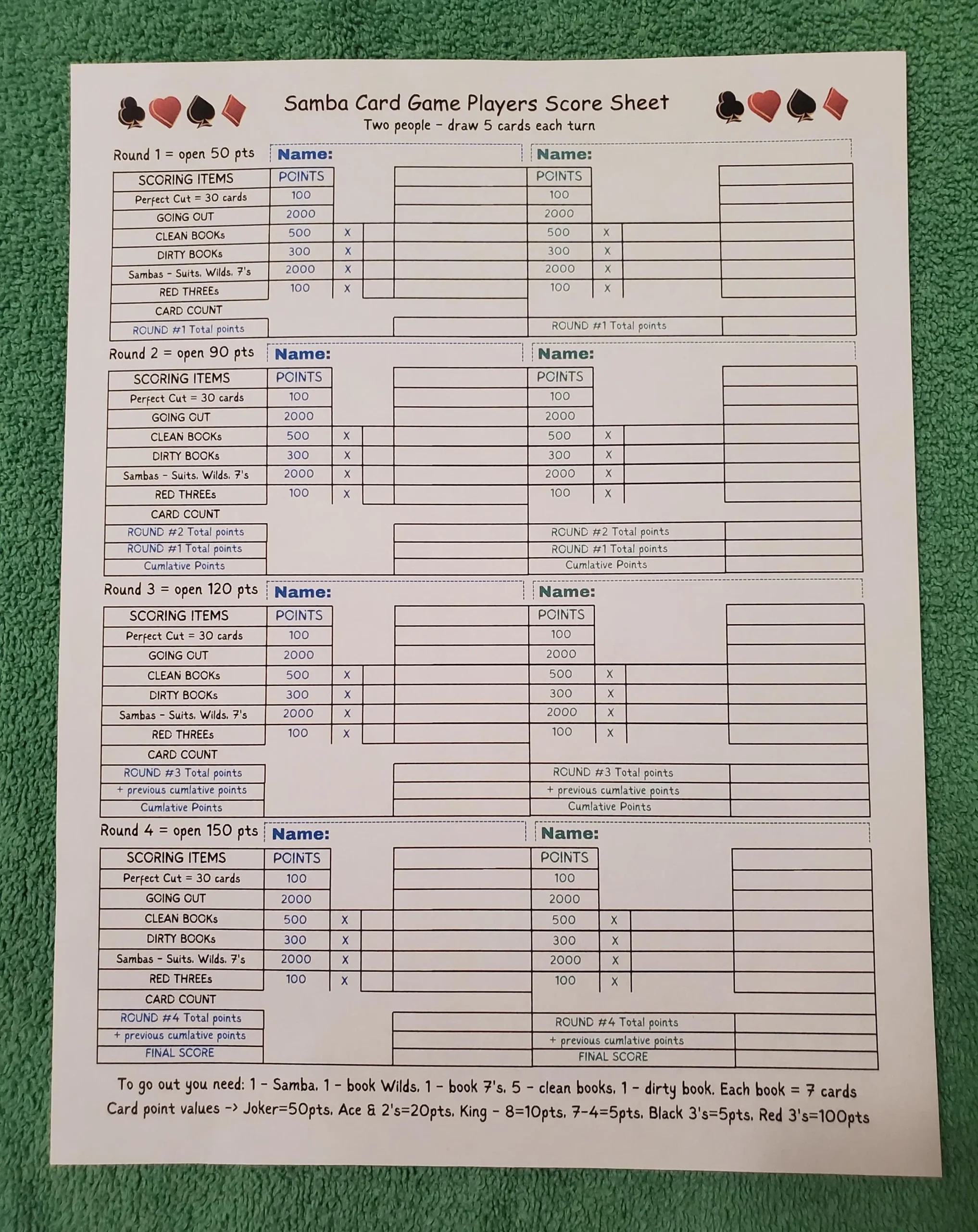 Samba Card Game Score Sheet For 2 Or 4 People Simple Easy To Understand Everything You Need On One Sheet Both Sheets In Download Etsy